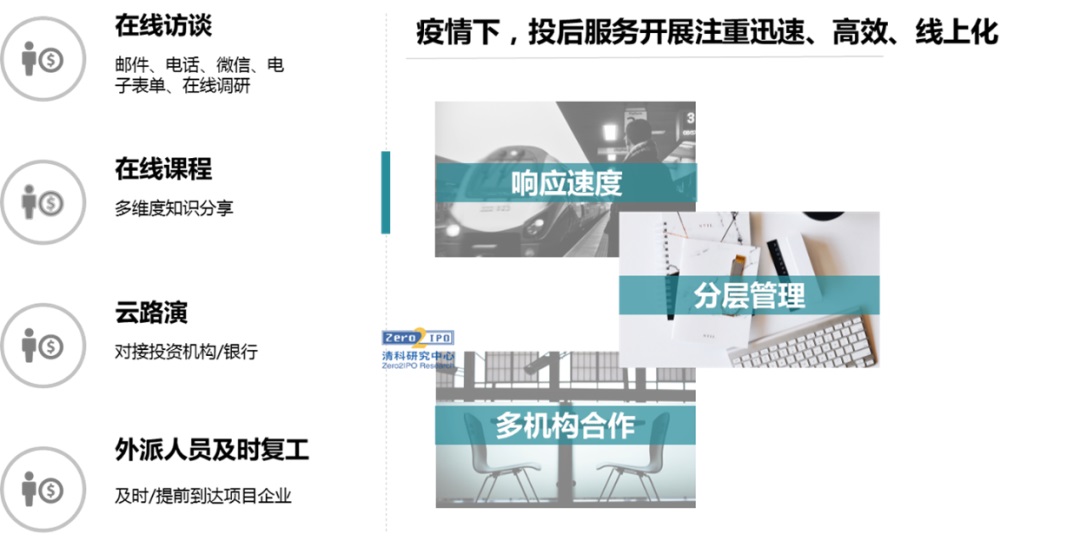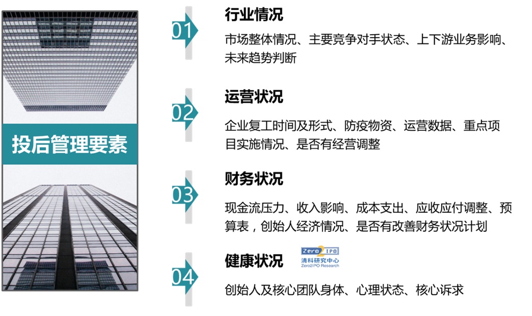 在嚴格的物理隔離之下,機構(gòu)投后服務(wù)開展注重高效化、線上化。通過在線訪談、電子表單等形式收集被投企業(yè)信息;通過線上課程解答眾多創(chuàng)業(yè)企業(yè)需要面對的共性問題;原本線下進行的資源對接會、路演也轉(zhuǎn)為了“云路演”,為企業(yè)高效對接資源。針對有外派人員的并購類、工程類項目,外派人員及時甚至提前到崗,加快企業(yè)安全復(fù)工復(fù)產(chǎn)。