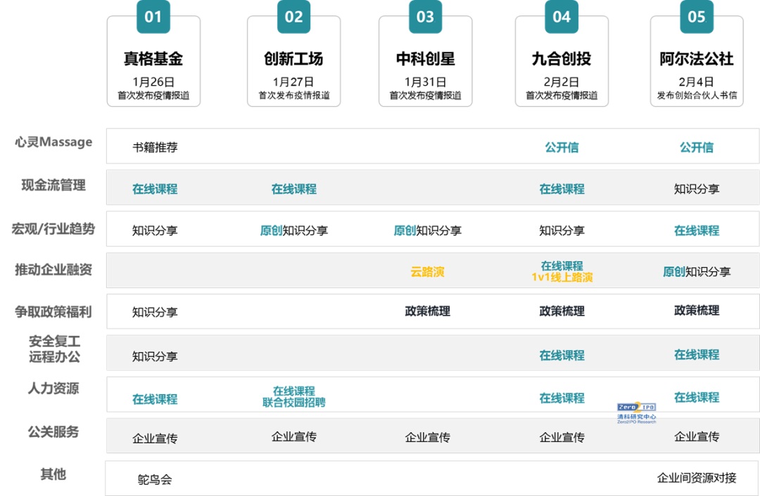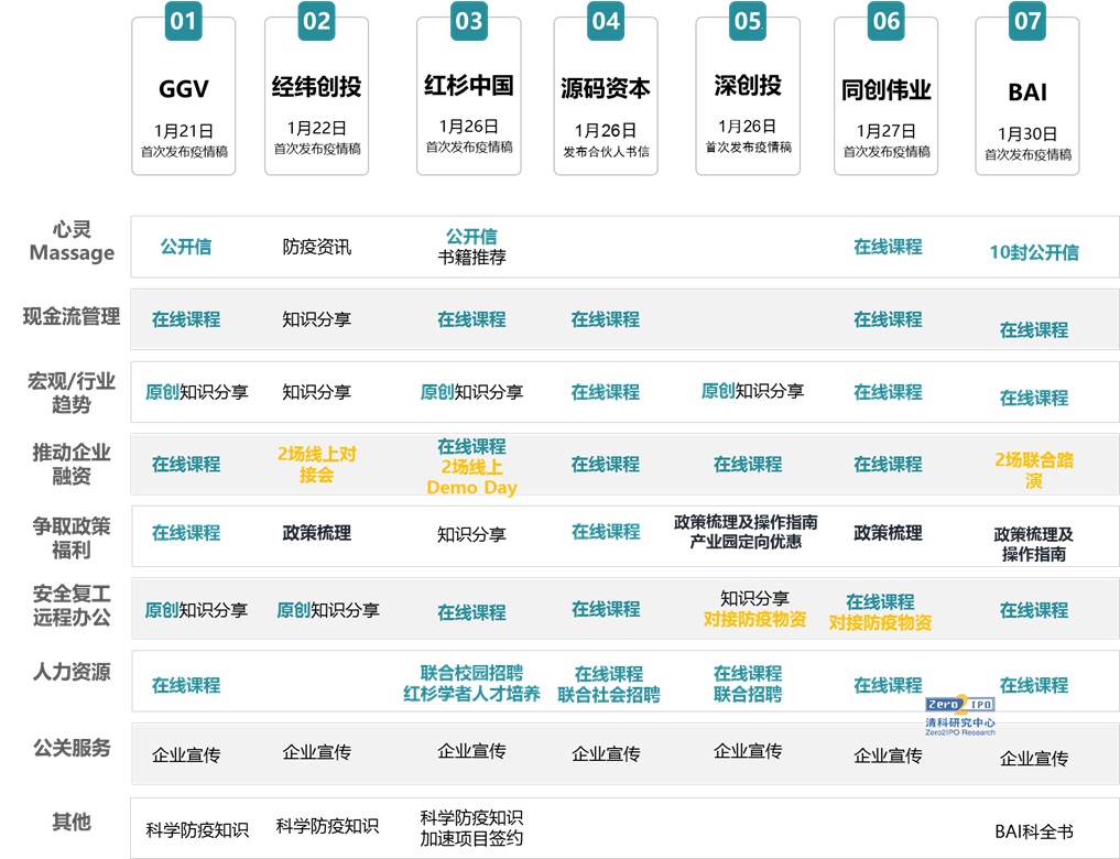 VC機構(gòu)是投后服務(wù)體系較為健全的一類。面對突發(fā)狀況,VC機構(gòu)投后服務(wù)啟動迅速,例如1月26日,紅杉中國即發(fā)布了《紅杉中國給成員企業(yè)的一封信》,發(fā)出對被投企業(yè)的三個提醒。紅杉、源碼資本、GGV等機構(gòu)均迅速開展了系列課程,涵蓋遠程辦公協(xié)作、勞動法規(guī)培訓(xùn)、疫情時期的融資策略、疫情期間的財務(wù)風(fēng)險管理以及疫情時期的人力資源優(yōu)化等方面。紅杉、經(jīng)緯、BAI率先嘗試了線上路演形式;紅杉、深創(chuàng)投、源碼資本幫助企業(yè)解決春招難題。