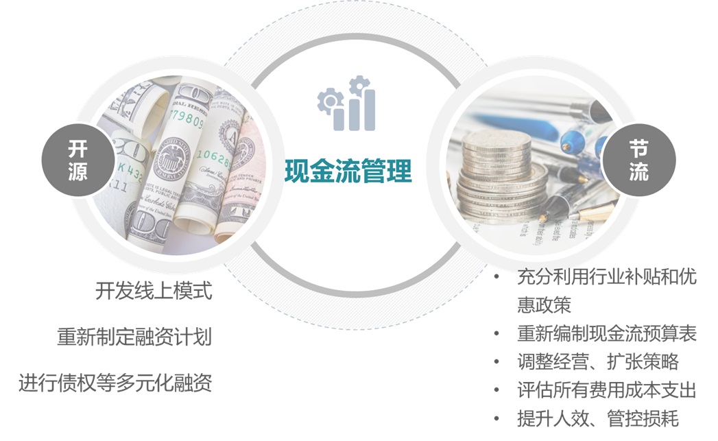 疫情之下,企業(yè)現(xiàn)金流出現(xiàn)危機,“開源節(jié)流”、“留足12個月運營資金”的呼聲不絕于耳。“開源”方面,鼓勵企業(yè)跳出原有運營模式,評估打造線上產(chǎn)品的可能性,同時重新制定融資計劃,全面了解“股權(quán)”和“債權(quán)”融資方式,調(diào)整估值預(yù)期。“節(jié)流”方面,充分利用行業(yè)補貼和優(yōu)惠政策,例如延遲繳納社保等,及時調(diào)整經(jīng)營策略,降低擴張速度和補貼力度,編制未來一年現(xiàn)金流預(yù)期表,及時處理應(yīng)收應(yīng)付,評估銷售、薪酬、房租等費用項目,制定合理降本計劃。