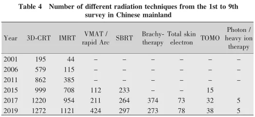放療新技術(shù)開展情況詳見表 4(Table 4) 。整體來說,三維適形放療技術(shù)(3-D conformal radiotherapy)、靜態(tài)調(diào)強放療技術(shù)(IMRT)等主流技術(shù)逐漸普及,旋轉(zhuǎn)調(diào)強放療技術(shù)(VMAT)、立 體 定 向 放 療 技 術(shù)(SBRT)、TOMO等放療新技術(shù)較既往調(diào)查穩(wěn)步增加,并有5家單位已開展或正準備開展質(zhì)子重離子技術(shù)。