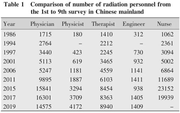 中國大陸地區(qū)從事放療的工作人員共29,096人,其中放療醫(yī)師14,575人、物理師4172人、技師8940人、維修師1409人。此次調(diào)查醫(yī)師整體數(shù)量較前有下降,但物理師、技師、工程師的數(shù)據(jù)仍有不同程度的上升,詳見表1(Table 1)。
