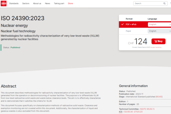 11月30日,由中輻院主導(dǎo)編制的國際標(biāo)準(zhǔn)ISO 24390:2023《核設(shè)施產(chǎn)生極低水平放射性廢物放射性表征方法學(xué)》正式發(fā)布,該標(biāo)準(zhǔn)是由我國在放射性廢物管理領(lǐng)域編制發(fā)布的首個(gè)ISO國際標(biāo)準(zhǔn),是中輻院高質(zhì)量發(fā)展和創(chuàng)建”國際一流”院所的又一重要成果,標(biāo)志著我國在放射性廢物治理領(lǐng)域的國際標(biāo)準(zhǔn)化工作取得重要突破